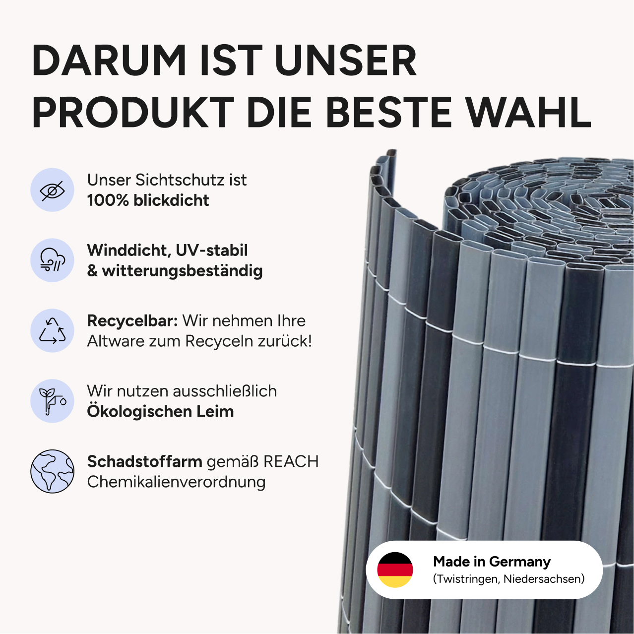 Die Videx © Sichtschutzmatten Rügen sind „Made in Germany“ aus Norddeutschland und als einzige PVC-Sichtschutzmatten am Markt tatsächlich zu 100 % blickdicht und ohne Zwischenräume gefertigt. Seit Jahrzehnten haben sich die Kunststoffmatten durch ihre ausgezeichnete Qualität und Langlebigkeit bewährt. Um die Sichtschutzmatten nachhaltig zu produzieren, wird zur Herstellung auch recyceltes PVC eingesetzt. Gebrauchte PVC-Sichtschutzmatten werden dazu zerkleinert und neu aufgeschmolzen. Sie können uns daher Ihre Altware auch nach vielen Jahren der Nutzung wieder zurücksenden. Die Herstellung ist schadstoffarm gemäß der REACH Chemikalienverordnung geprüft.