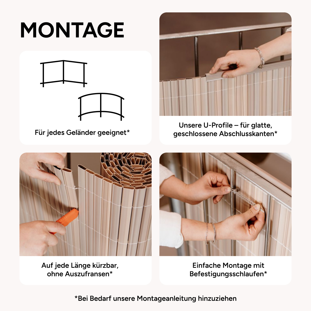 Für die Sichtschutzmatten aus Kunststoff erhalten Sie farblich genau abgestimmtes Zubehör . Dazu gehören UV-beständige, wiederverschließbare Befestigungsschlaufen (Bambus) um die Sichtschutzmatten am Balkongitter zu befestigen, sowie U-Profile (Bambus), die auf die obere Kante der Sichtschutzmatte geschoben werden und eine saubere Abschlusskante bilden und den Balkon-Sichtschutz optisch aufwerten, sowie Mattenverbinder (Bambus) mit denen zwei Sichtschutzmatten ohne Spalt verbunden werden können, wenn die Sichtschutzmatten über das feste Rollenmaß hinaus verlängert werden sollen.