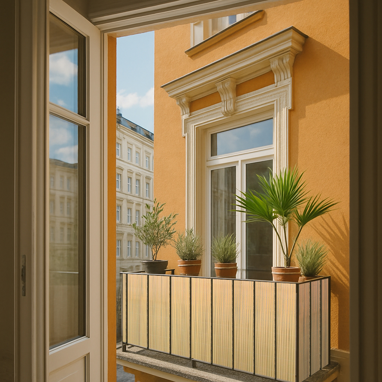 Diese Kunststoff-Balkonverkleidung in Bambus ist ein Klassiker! Die Kunststoff-Sichtschutzmatten imitieren den warmen, gelblichen Bambus-Farbton sehr naturgetreu, denn die einzelnen PVC-Röhrchen sind in sich, wie ein Bambusrohr, mehrfarbig gefärbt. Der naturfarbene, helle Bambus-Look der Sichtschutzmatte passt sich wunderbar einem Balkon mit natürlichen Stil an. Die Kunststoff-Sichtschutzmatten Rügen sind dabei absolut blickdicht, sie bieten perfekten Windschutz und bleiben auf viele Jahre ein gepflegter und dekorativer Sichtschutz. Die PVC-Sichtschutzmatten sind in der Form flexibel und passen sich jeder Balkonform an. Rundungen und Ecken eines Balkongitters können mit den Sichtschutzmatten gut modelliert werden.